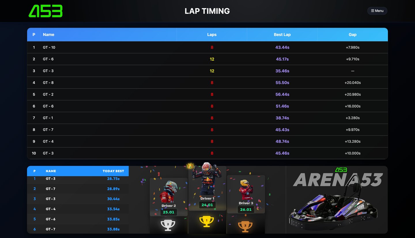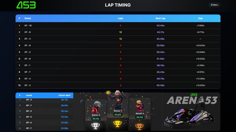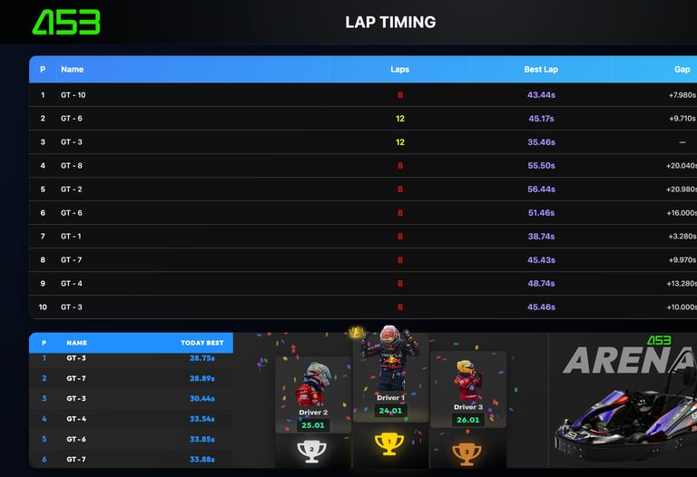 Track your performance in real-time with Arena53’s advanced lap timing system. Whether you're aiming for the fastest lap or trying to beat your personal best, our system records lap times, positions, and overall rankings—live, as you race.
